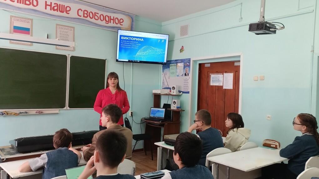 В честь празднования Дня воссоединения Крыма с Россией, который отмечается 18 марта, в нашей школе состоялась увлекательная викторина под названием "Одна страна — одна Россия", организованная советником директора по воспитанию, куратором Движения Первых Калачевой Т.С.